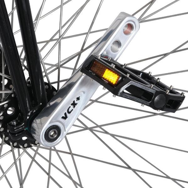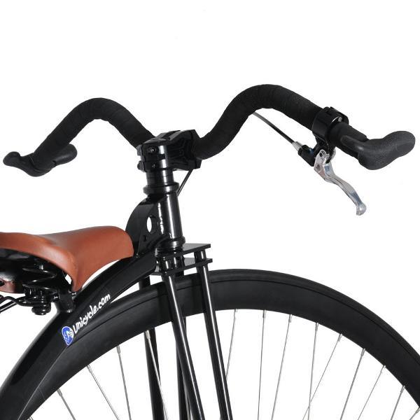 The frame is made from CrMo and has a moveable rear fork to allow you to change the front fork rake for different riding preferences. As well as the standard double step which is ideal for coasting there is an additional lower step that can be set to the left or right to help mounting. There is even a hole on the front fork to house spare spokes. This Penny Farthing comes with black tyres and a brake as standard.